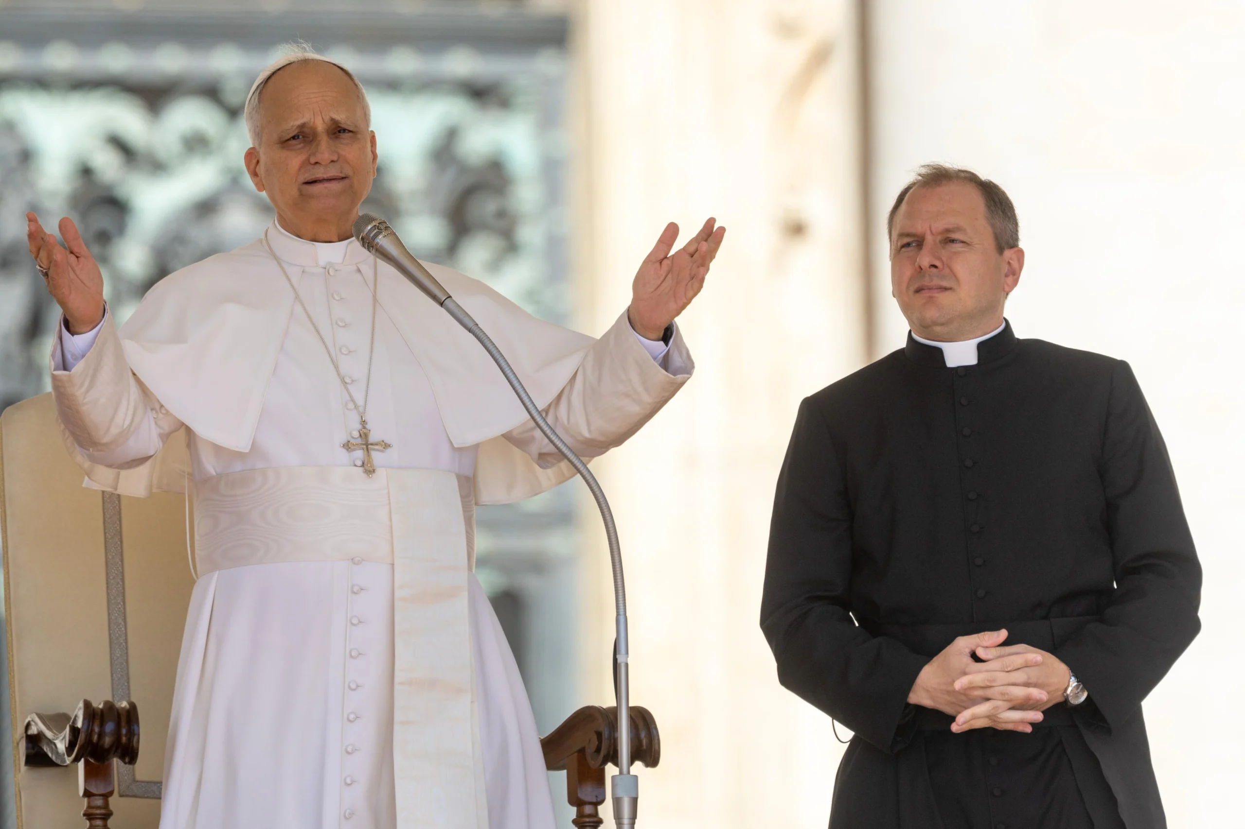 Pope Leo XIV holds his first weekly general audience in St. Peter's Square at The Vatican, Wednesday, May 21, 2025. (AP Photo/Gregorio Borgia)